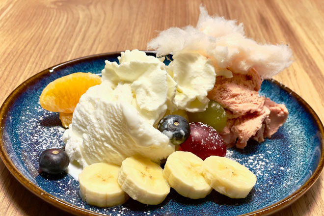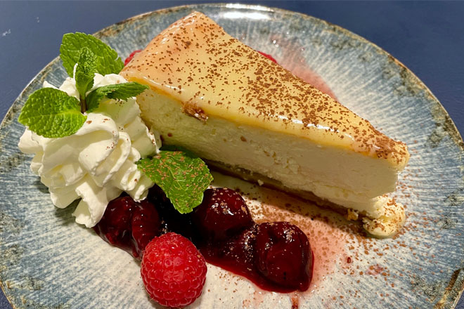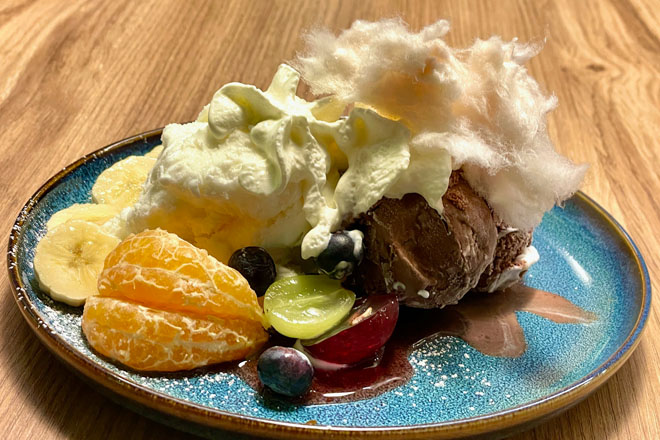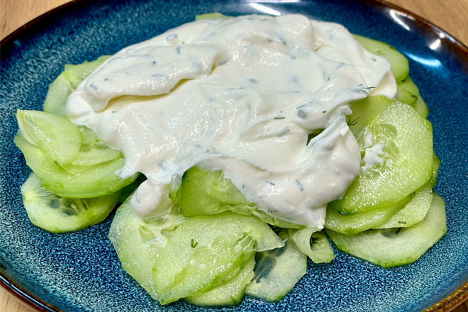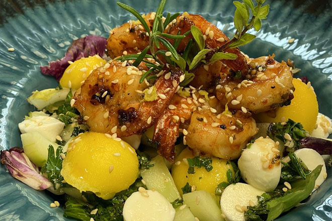 mango, ser koryciński, pomarańcza, ogórek i sos orientalny