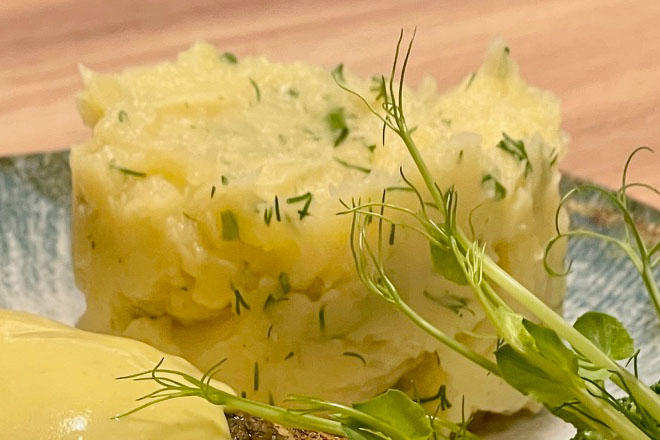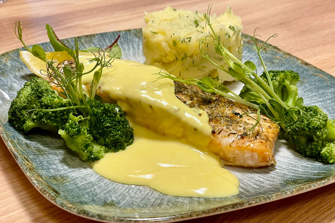 z sosem cytrynowym, brokuł gotowany, purée ziemniaczane