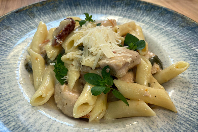Penne z parmezanem, szpinakiem i kurczakiem z patelni42 zł