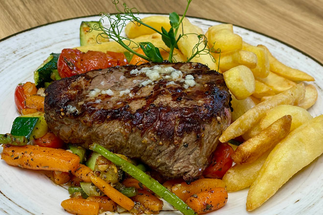 z sosem borowikowym, ziemniaki opiekane z ziolami